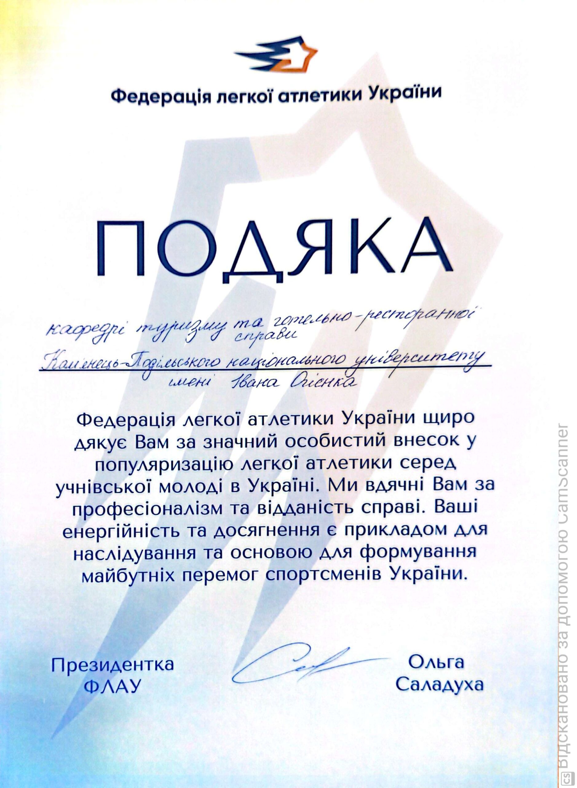 Колектив кафедри туризму та готельно-ресторанної справи Кам’янець-Подільського національного університету імені Івана Огієнка отримав подяку від президента Федерації легкої атлетики України, народного депутата України Ольги Саладухи за професіоналізм та відданість справі.