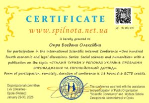 Доцент кафедри туризму та готельно-ресторанної справи Богдана Опря продовжує залучати здобувачів освіти спеціальності J3 «Туризм та рекреація» до наукової діяльності. У співавторстві зі студенткою 1 курсу бакалаврату Владою Куліковою була підготовлена наукова стаття в області туризмознавства. Здобувачка брала активну участь у дослідженні та підготовці матеріалів.