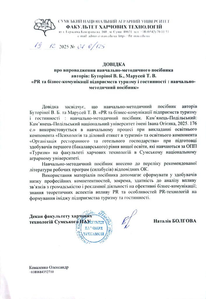 Буторіна В.Б., Марусей Т.В. PR та бізнес-комунікації підприємств туризму і гостинності [Електронне видання]. Кам’янець-Подільський: Кам’янець-Подільський національний університет імені Івана Огієнка, 2025. 153 с. URL : http://elar.kpnu.edu.ua/xmlui/handle/123456789/8644