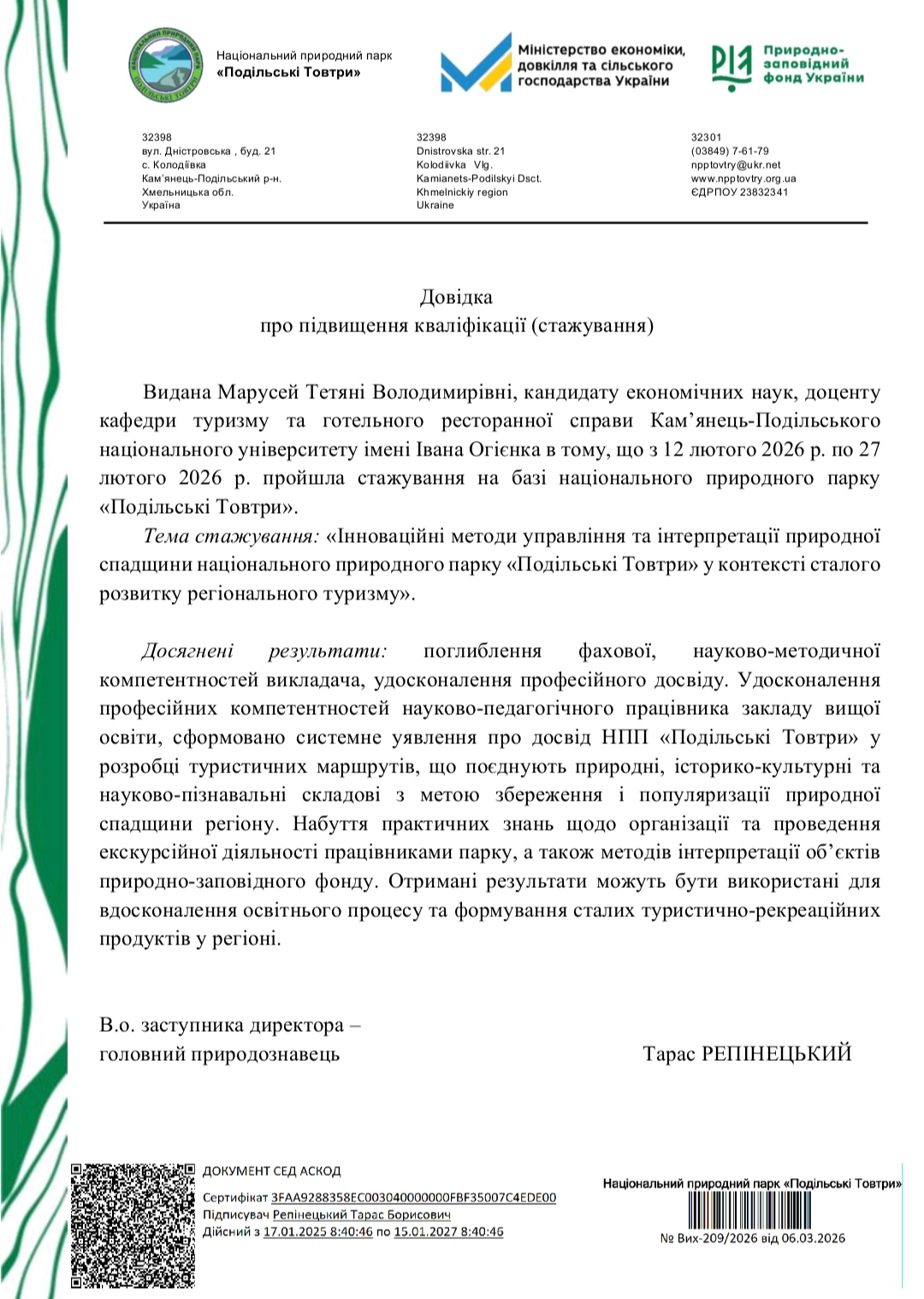 Марусей Т. В. Підвищення кваліфікації (стажування) «Інноваційні методи управління та інтерпретації природної спадщини Національного природного парку «Подільські Товтри» у контексті сталого розвитку регіонального туризму». Національний природний парк «Подільські Товтри». З 12 лютого по 27 лютого 2026 р., (30 годин, 1 кредит ECTS). ЗАВАНТАЖИТИ