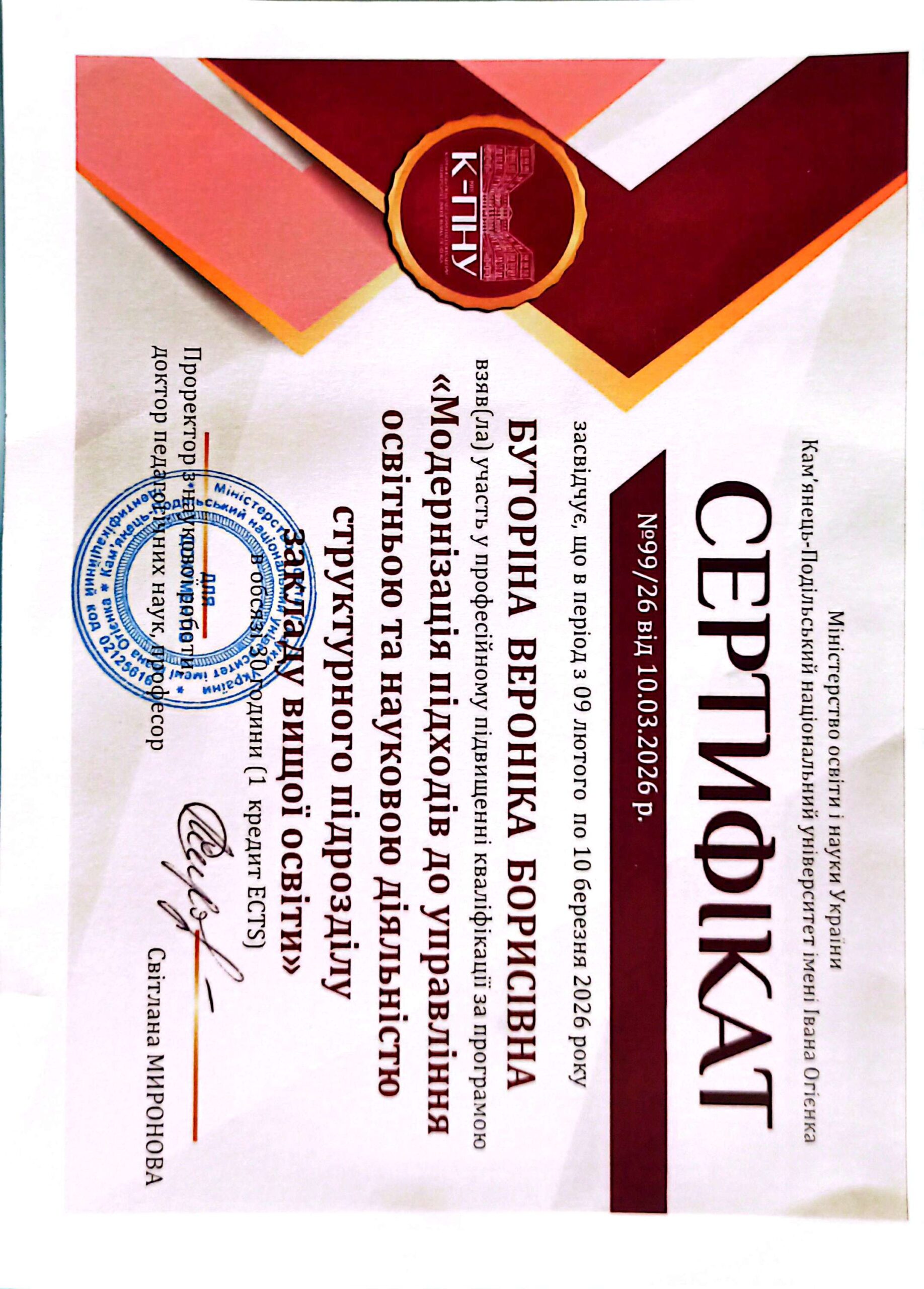 Буторіна В. Б. Сертифікат про підвищення кваліфікації “Акредитація освітніх програм: механізми забезпечення якості вищої освіти в К-ПНУ” (60 год.) (жовтень-грудень 2025) № 776/2025 від 03.12.2025 р. ЗАВАНТАЖИТИ;