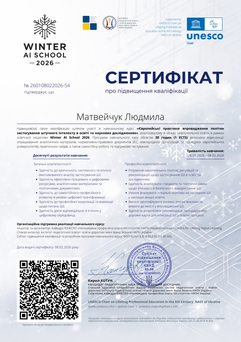 Матвейчук Л.О. Навчальний курс “Європейські практики впровадження політик застосування штучного інтелекту в освіті та наукових дослідженнях”. (16.02.2026-28.02.2026). ЗАВАНТАЖИТИ